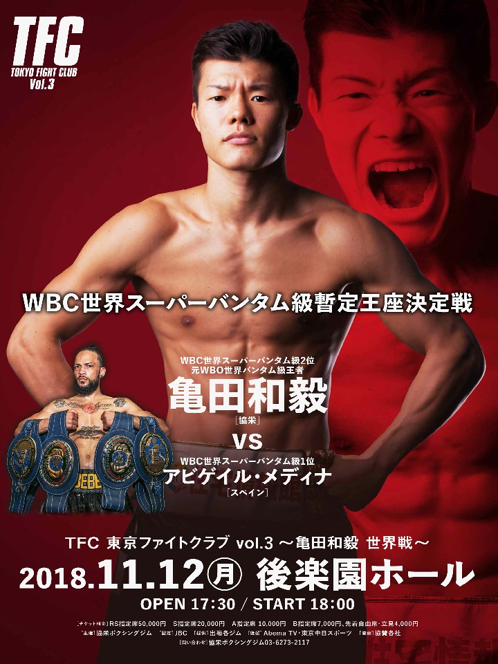 注目: 亀田和毅が2本目のベルトを狙う! WBC世界Sバンタム級王者のレイ・バルガス(メキシコ)の負傷により設置された暫定王座を同級1位のアビゲイル・メディナ(スペイン)と争う。戦績24戦19勝(10KO)3敗2分のメディナは欧州Sバンタム級王座を4度防衛し、2013年12月のジェイミー・マクドネル(英)戦以降は10連勝と勢いのある選手。遠い距離から飛んでくる右のオーバーハンドと、チャンスにたたみかける決定力が武器だ。強豪を迎えるが2015年9月にマクドネルの持つWBA世界バンタム級王座に挑戦して以来、約3年ぶりに世界戦のリングへと上がる和毅は「俺が負けることは絶対にない」と気を吐く。序盤から仕掛けてくるメディナに対し、スピードで翻弄し疲弊させたい。パワーもついたと自信を見せる亀田にKO勝ちの期待がかかる。