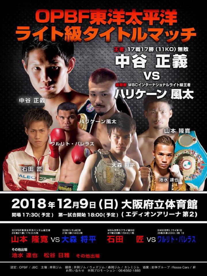 注目:中谷vsハリケーン実に11度目の防衛戦を迎えた王者の中谷。挑戦者のハリケーンは海外で2本のタイトルを手にし、34戦目でビックタイトルのチャンスを得た。このまま勝ち続け世界のチャンスを待つ中谷はここで負けるわけにはいかない。激戦必至の好カード。