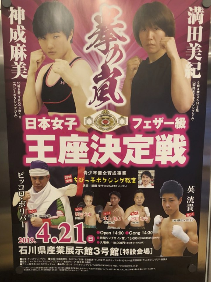 注目:両者は昨年8月に対戦し神成が3回TKO勝ちしている。パワフルな攻撃が武器の主婦ボクサー神成は、3度目の挑戦で悲願の日本王座獲得を目指す。一方、好戦的なファイトスタイルの満田は、2月の挑戦者決定戦を2回TKO勝ちし挑戦権をゲット、神成へのリベンジとベルト奪取を狙う。前回同様、激しい打撃戦が繰り広げられそうだ。
