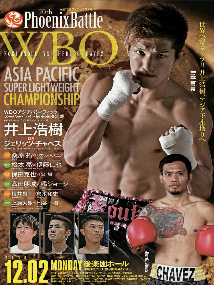 注目:無敗の日本王者、井上が2本目のベルト獲得を目指しWBOアジアパシフィック王座決定戦に出場する。相手のチャベスは戦績14戦9勝(7KO)3敗2分のオーソドックススタイルのハードパンチャーで、17年6月に元世界ランカーの岡田博喜(角海老宝石)、さらに18年5月には内藤律樹(E&Jカシアス)の持つOPBF同級王座に挑戦した。いずれの試合も判定負けを喫したが、内藤からは2度のダウンを奪い健闘した。スピードで上回る井上は、最後まで集中力を切らさず戦い抜きたい。