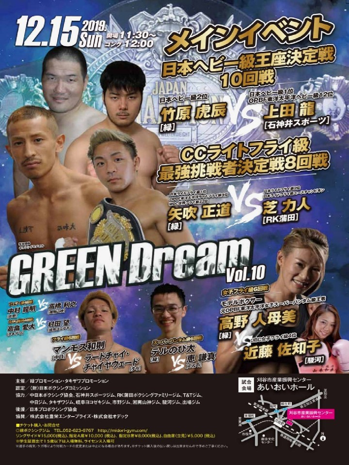 注目:新王者、高橋悠斗(K&W)への挑戦権をかけて中部と関東のホープが激突。矢吹は今年5月に日本ランカーの大保龍斗(横浜さくら)にKO勝ちしランキング入りすると、トップコンテンダーまで上り詰めた。右の強打が光るが、前戦では多彩な左で翻弄し対応力の高さを見せた。対する芝は今年9月に川畑嗣穂(ワタナベ)にダウンを奪う快勝でユース王座を獲得。抜群のタイミングから打ち込まれる右カウンターが魅力だ。試合はお互いに倒しにいくだろう。芝が先に仕掛けて矢吹が左で迎え撃つ展開が考えられる。