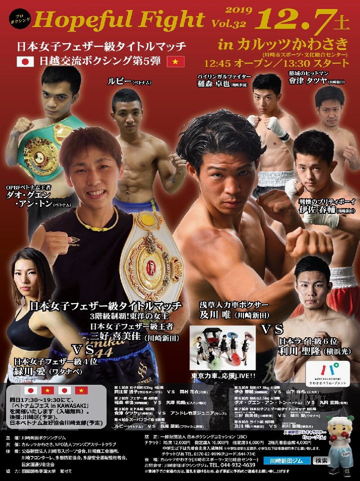 注目:今年9月に日本王座を獲得した三好の初防衛戦。挑戦者の緑川は5戦全勝(1KO)でタイトル初挑戦。テクニックとキャリアで上回る三好は、無敗の新鋭に力の差を見せて世界へつなげたい。緑川は序盤の先制攻撃は必須。その上でチャンピオンに焦りを誘う秘策が必要だ。
