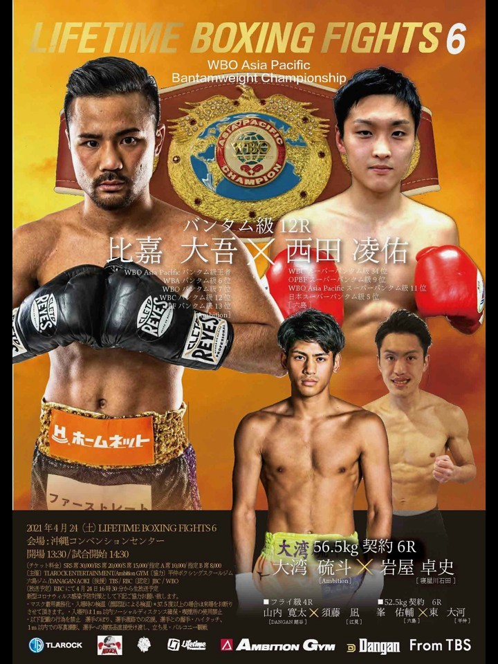 比嘉は、昨年の大晦日にWBO-AP王座奪取に成功。アッパーを交えた上下のコンビネーションでストロング小林佑樹(六島)を攻略し完全復活を印象付けた。約3年3ヶ月ぶりとなる地元沖縄のリングで世界王座返り咲きをアピールしたい。4戦目でタイトル初挑戦の西田は、昨年12月に大森将平(ウォズ)に判定勝ちしてランク入りを果たした。アマチュア仕込みのテクニシャンだが、打ち合いにいく勝負強さも持ち合わせている。ベルト獲りと同門で引退した小林の敵討ちを目指す。