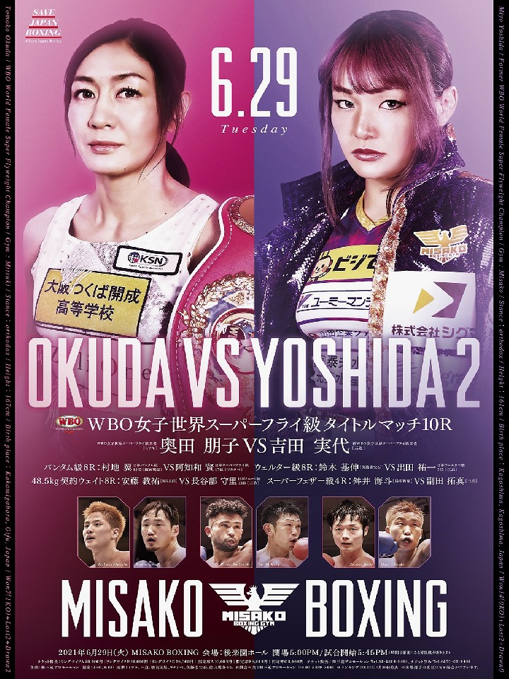 試合:昨年12月に新王者に就いた奥田が、前王者の吉田と舞台を東京に移して、ダイレクトリマッチに臨む。前戦は、奥田が初回に右ストレートでダウンを奪い6回負傷判定勝ちでベルト奪取に成功した。長身から繰り出されるジャブと右カウンター、さらに接近戦ではクリンチで攻撃を遮断する上手さを持つ。初防衛戦で進化した姿を見せる。王座奪還に燃える吉田は、相手の長いリーチをかいくぐり細かいパンチでジャッジに攻勢をアピールしていきたい。手の内を知り尽くしている両者が、どのような対策を練ってくるのか!?