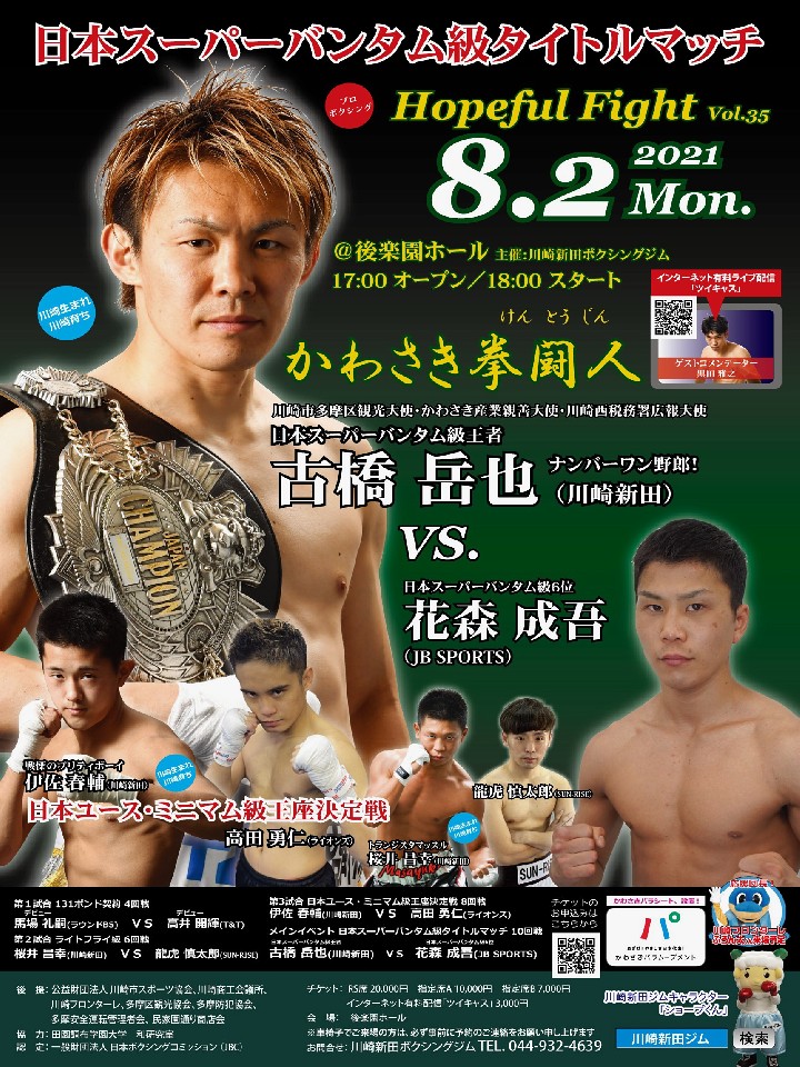 両者は2019年2月に対戦し、高田が判定勝ちしている。A級初戦で日本ユース王座初挑戦となる伊佐は、出入りを意識したワンツー主体の正統派スタイルだ。高田は、今年4月に前王者の石澤開(M・T)が保持していた日本ユース王座戦に挑戦したが、2-0の判定負けを喫した。ここ4戦は勝ち星に恵まれていないものの、強豪を相手に確実にキャリアを重ねている。再起戦で再びユース王座に挑む。接戦が予想される中、両者とも明確にポイントを取り切る攻撃力を見せたい。