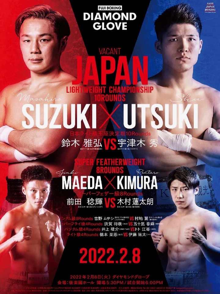 吉野修一郎(三迫)が返上した王座を前日本スーパーライト級王者の鈴木と全勝の宇津木が争う。2階級制覇を目指す鈴木は、2021年10月の日本王座挑戦者決定戦で利川聖隆(横浜光)と対戦。壮絶な打撃戦を制した。決定力の高い左フック、多彩なコンビネーションが光る。すべてにおいて高い能力を持つ。タイトル初挑戦の宇津木は、豊富なアマチュアキャリアを経て2018年3月にデビューすると、5戦目でランキング入り。ここまで9戦全勝(7KO)を誇る。ジャブから上下に打ち分ける基本に忠実なタイプで、こちらも平均値が高い。伝統の日本タイトル戦に相応しい好勝負が期待される。