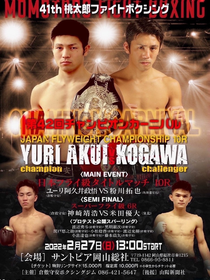 日本フライ級王者阿久井のV3戦。昨年7月に桑原拓(大橋)に10回TKO勝ちし2度目の防衛に成功した。重厚なプレスから一撃で仕留める右ストレート、強烈なボディブローは相手にとって脅威となる。世界ランキングにも名を連ねた阿久井が、地元岡山で2022年初戦を迎える。3度目の王座返り咲きを目指す粉川は、昨年3月に小坂駿(SUN-RISE)に判定勝ちし日本ランカー対決を制した。回転力を活かした連打とポイントをピックアップする試合運びに長けたテクニシャンだ。真っ向からの打ち合いは分が悪いので、被弾を最小限に抑えて焦りを誘いたい。