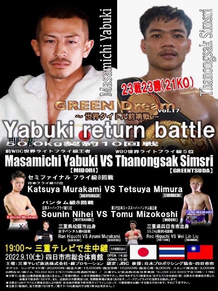 前WBC世界ライトフライ級王者矢吹の再起戦。寺地拳四朗(BMB)との再戦に敗れて王座を陥落した矢吹だが、世界王座返り咲きを目指しリングに戻ってきた。豪快なKO勝ちで元気な姿を見せたいところだ。序盤の攻防に注目していきたい。グリーンツダジムと契約しているタイ人ボクサー、タノンサックは23戦全勝(21KO)。知名度のある矢吹を撃破し世界戦線に名乗りを上げたい。KO決着濃厚の一戦となりそうだ。