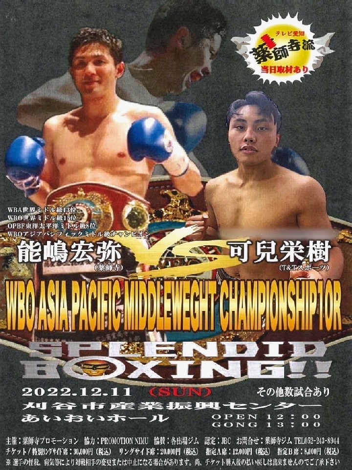 WBO-AP王者・能嶋の初防衛戦。今年7月に大阪で野中悠樹(渥美)に初挑戦。持ち前のスピードを活かした攻撃で序盤からペースを握り、番狂わせの6回TKO勝ちで新チャンピオンに輝いた。ウェルター級から2階級上げての試合が吉と出た。タイトル初挑戦の可兒は、今年10月に韓国で勝利。わずか2ヶ月弱でリングに上がる。多彩な左とボディワークが武器の右ボクサーファイターだ。前戦、アウェーで勝利をもぎ取っており、勢いをつけて刈谷に乗り込む。