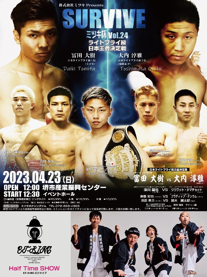 見どころ:冨田は、昨年12月の王座決定戦(引き分け)に続き2度目の挑戦。長いリーチを活かしたジャブと角度のある左ボディを得意とする。5度目の挑戦のベテラン大内は、1年ぶりのリング。これまで培ってきたキャリアをぶつけて悲願のベルト奪取に闘志を燃やす。両者とも喉から手が出るほど欲しいベルト。勝利の女神が微笑むのは?