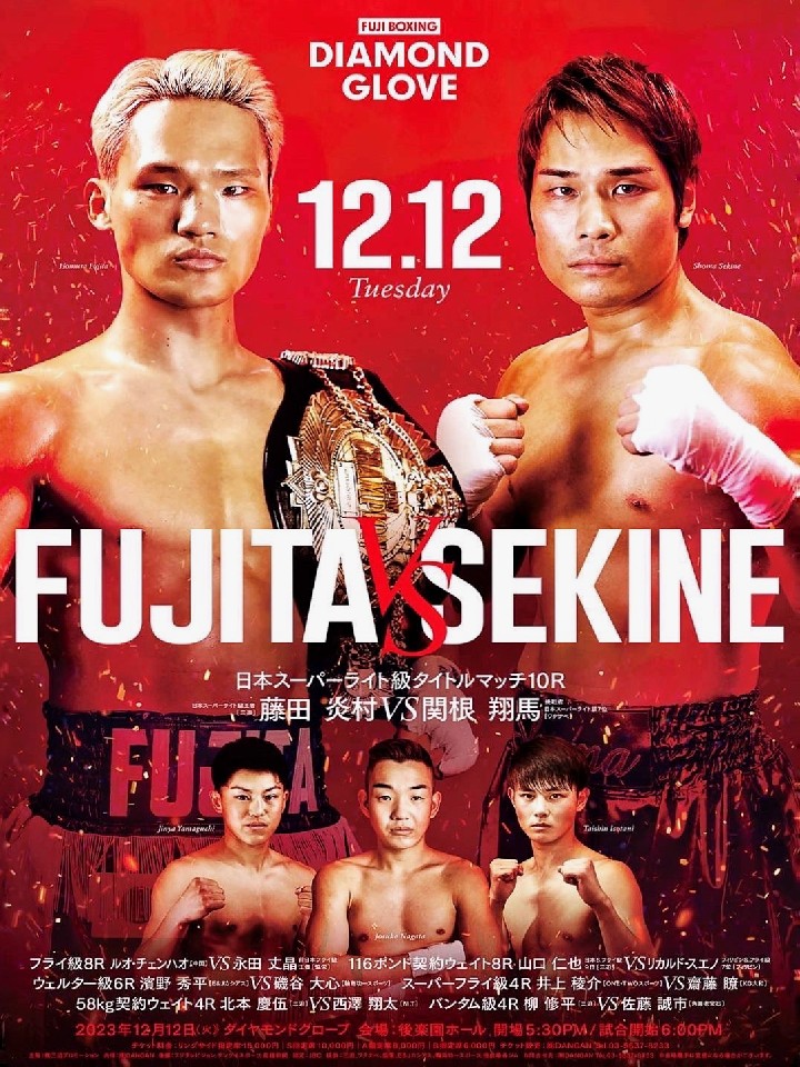 日本Sライト級王者の藤田のV2戦。今年8月の初防衛戦では、指名挑戦者の大野俊人(石川ジム立川)に3回TKO勝ち。左右ともに殺傷能力の高いパンチに加えて冷静な試合運びも光る。チャンピオンとして着実にキャリアを重ねている。タイトル初挑戦の関根は昨年12月にランキング入りを果たした。プレスをかけながら積極的な攻撃を得意とする。強打の藤田に対しどのように崩していくか?