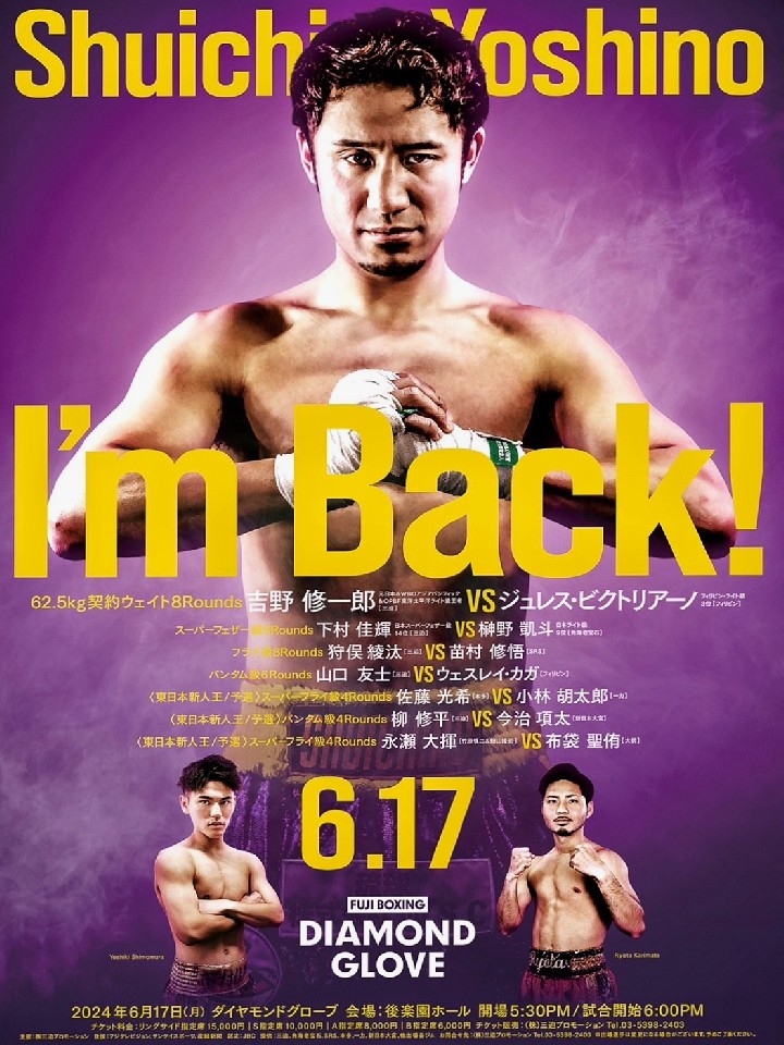 元アジア3冠王者の吉野が1年2ヶ月ぶりに再起戦に臨む。昨年4月、シャクール・スティーブンソン(米)とのWBC世界ライト級挑戦者決定戦で敗れたが、ここで得た経験は大きいはずだ。ビクトリアーノを豪快に倒して、復活への足掛かりとしたい。