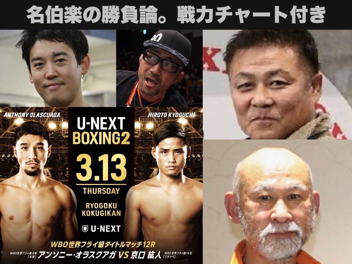 2度目の防衛戦に臨むオラスクアガは、重厚なプレスから思い切りの良い左右フック、アッパーで攻め立てる攻撃型。スタミナも豊富でグイグイと攻めて自分のペースに引きずり込むのを得意とする。京口は、昨年10月にビンス・パラス(比)とのラバーマッチを勝利。左ボディから左フック、左右アッパーは決定力が高くこちらも豊富なスタミナを持つ。3階級制覇にモチベーションはMAXだ。序盤から激しい打ち合いは必至。最後まで気持ちと気持ちがぶつかり合う激戦になるだろう。