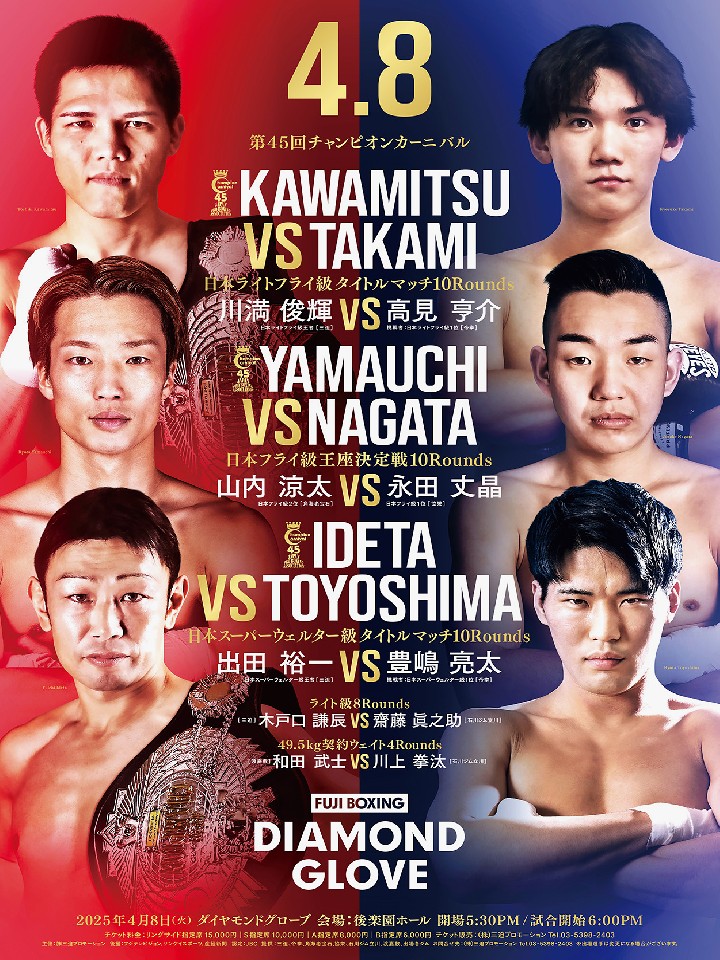 日本Lフライ級王者の川満のV3戦。左右ともに決定力のあるパンチと勝負所で仕留めに行く爆発力が魅力。ここまでタイトルマッチをすべてKOで終わらせている。最強挑戦者を迎えた真価が問われる一戦だ。タイトル初挑戦の高見は、速いテンポと角度を変えたコンビネーションが光る22歳のホープで、世界ランキングも上位に名を連ねている。序盤から目が離せないKO決着濃厚な一戦だ!