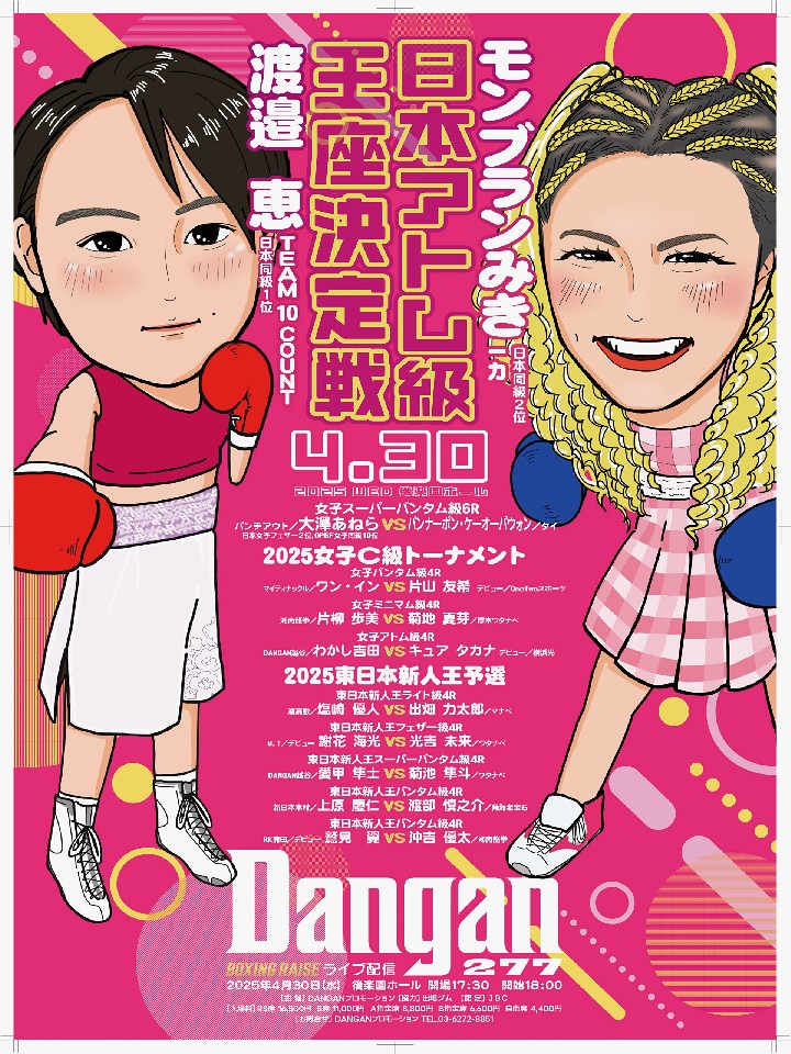 渡邉は、出入りを意識しながら回転力を活かした連打を得意とする。アトム級での試合は2年7ヶ月ぶりだ。スロースターターな傾向があるので序盤から仕掛けていきたい。モンブランは、ワンツー左ボディを主体とした右ボクサーファイター。強豪と拳を交えており、豊富なキャリアを持つ。これまでの悔しさをバネに思いをぶつける。
