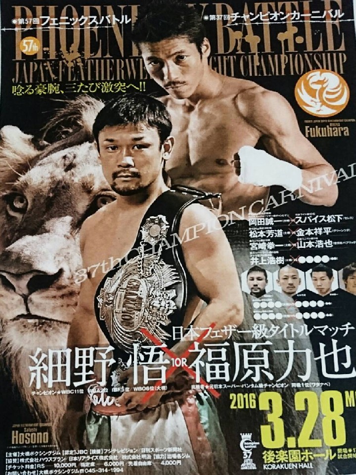 注目:防衛ロードをひた走る細野の6度目の防衛戦は約10年ぶりの王座返り咲きを目指す福原との対戦となった。過去2度にわたり細野に苦汁を飲まされている福原は、リベンジ、ベルト獲得、世界ランク奪取とまたとないチャンス。細野の牙城は高いが強打を打ち抜きたいところ。”バズーカ"の異名を持つ細野は4試合連続判定勝ち。そろそろKOが欲しいところ。