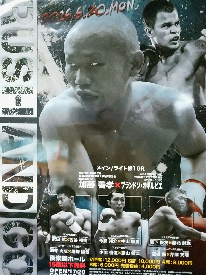 注目:元日本・東洋太平洋ライト級王者の加藤が再浮上を狙う一戦。7度防衛したベルトを返上して世界へと打って出た加藤だが、昨年、原田門戸に判定負け、そして前戦は敵地インドネシアで世界ランカーのダウド・ヨルダンと拳を交えたが負傷判定で敗れた。しかし、アウェーで堂々の戦いを演じた加藤に悲壮感はないはずだ。相手となるオギルビエ(オーストラリア)はWBA世界同級10位、戦績は17戦16勝(8KO)1敗で現在、11連勝中と好調をキープする22歳、加藤戦で今年4戦目となる。加藤は持ち味のフィジカルの強さとテクニックでオギルビエの勢いを止めたい。負けたら後がない加藤にとっては勝負の一番となるが、再び世界ランクを手に入れるチャンスでもある。
