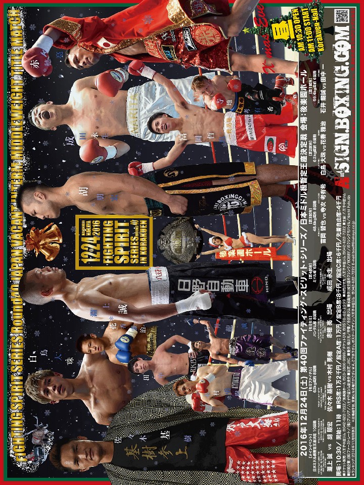 注目:現王者の西田光(川崎新田)の負傷により設けられた暫定王座決定戦。約3年5ヶ月ぶりのタイトル戦となる胡は現在4連続KO中。一時は階級を上げていたがミドル級に戻ると復調。持ち前のパワーに食わせて激戦を勝ち抜く勝負強さも身に付けた。対する2位の淵上は9月に西田に挑戦予定だったが、相手側の都合で試合中止。仕切り直しでのタイトル戦出場となる。前戦ではロックハート・ブランドンシェーン(森岡)に2度のダウンを喫したものの、3回逆転KO勝ちを納めた。試合は強力なプレスをかけてくる胡にサウスポー淵上がどう対応するのか?淵上は序盤から打ち合っては分が悪い。しかし、フルラウンド捌き切るのは容易ではなくどこかで打ち合う場面も必要となってくる。淵上の出方次第で試合の流れが決まってくるだろう。
